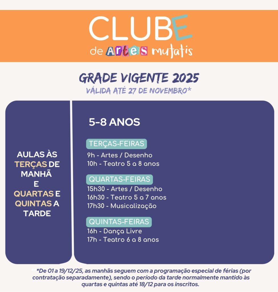 No nosso Clube de Artes para crianças de 5 a 8 anos, a sua criança pode experienciar o teatro, a dança, a musicalização e as artes visuais através do desenho e pintura. Você escolhe a modalidade, dia e horário de acordo com a disponibilidade de vocês.