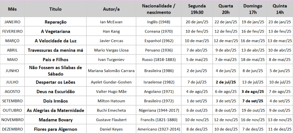 TURMAS DISPONÍVEIS DO CLUBE DE LEITURA – Literatura que Inspira: